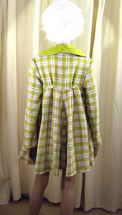 This coat was cut wide all around the bottom for a little extra drama and fullness. I also added some extra interest by putting in welt pockets on the side fronts and next to the lapel. Welt pockets are easiest to do on plaid because the outline of the pocket is built in to the fabric, and as I have said before, when it comes to using plaid, it is best to let the pattern on the fabric work for you and not against you.You may remember I have used this material before. I bought the whole bolt when I got it because it it's SO very hideousgorgorgeous 60's, I couldn't resist. It was also very cheap, so that didn't hurt, either.
